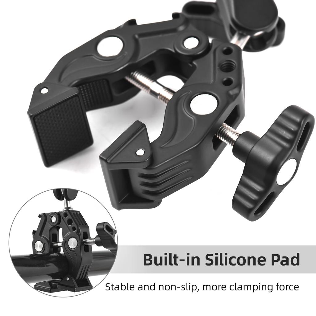 (Dual Crab Clamp Design)The super clamp mount features a dual clamps design, allowing it to be securely fixed to handlebars, crossbars, light stands, or flat surfaces, making it ideal for outdoor photography and video recording.