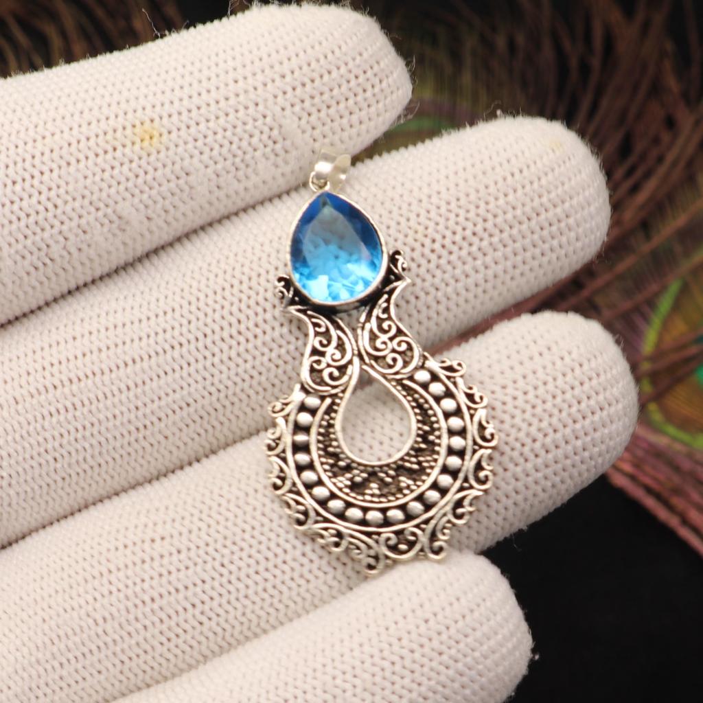 Swiss Blue Topaz Gemstone 925 Sterling Silver Jewelry Long Oxidize Pendant 1.8" For Thanksgiving Gift CP-45-8