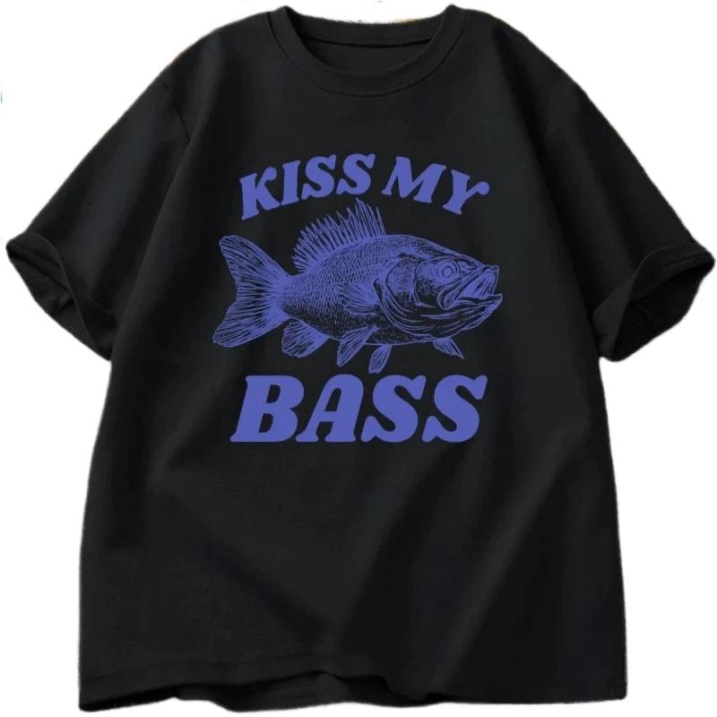 Retro Angel T-Shirt Kiss My Bass Tee Lustiges Damen Papa Opa Angel T-Shirt Outdoor-Mensch Humor Top Angler Geschenk Kleidung T-Shirt