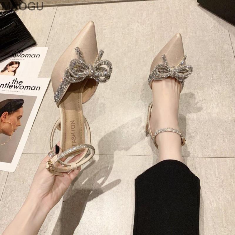 Damen Mode Sandalen Spitz zulaufend Kristall Knöchelriemen Hohe Hacken Sandalen Schwarze Schleife Seltsamer Stil Damenschuhe Tacones Mujer