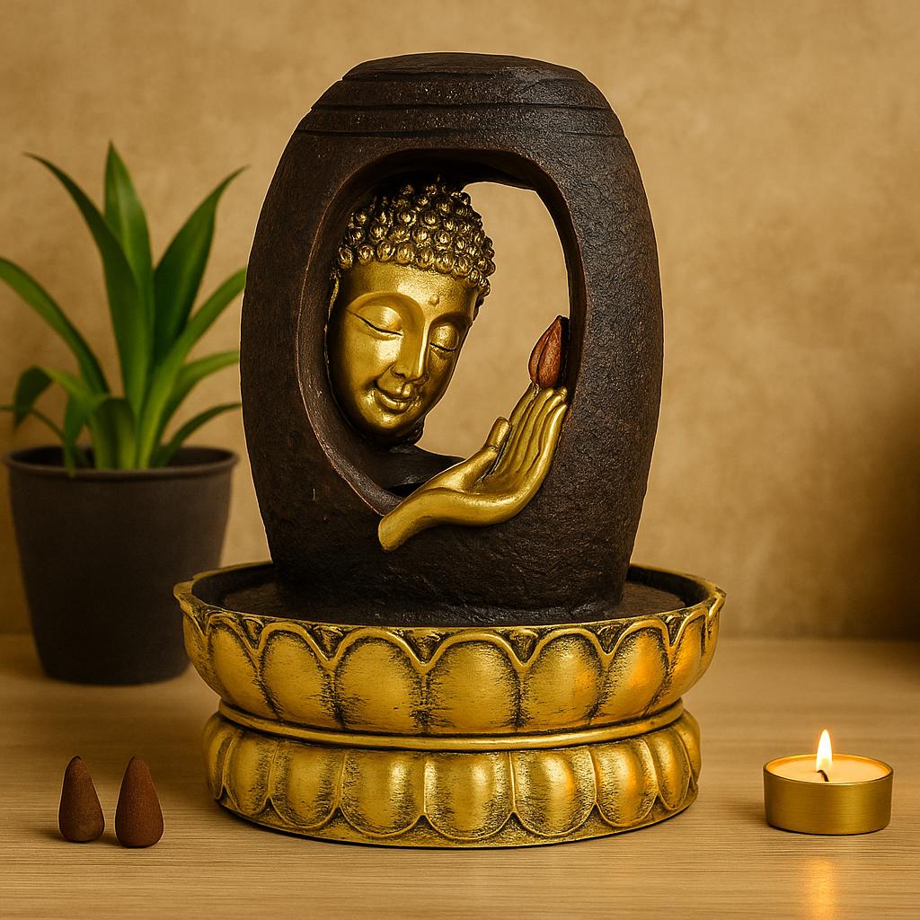 Das sanfte Plätschern des Wassers sammelt sich um einen ruhigen goldenen Buddha, der in einem mattschwarzen, ovalen Rahmen steht.. Gebürstetes Gold trifft auf steinerne Texturen, mit einer lotusblütenförmigen Basis, die sich geerdet und ruhig anfühlt.. Die kleine Kugel, eingebettet in eine fließende Form, fängt das Licht ein und suggeriert Kontinuität und einen leichten Rhythmus.. 💧🪷