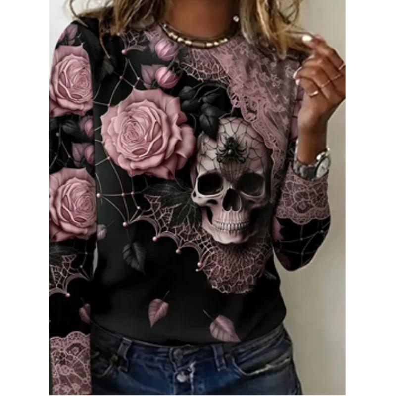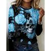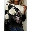 (Halloween neuer Stil) Rundhals-T-Shirt mit Totenkopf-Blumen-Print und langen Ärmeln