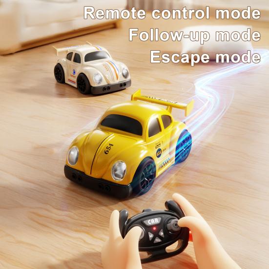 Designed in a cute Beetle shape with a classic look and racing tail wing, it appeals to children's aesthetics with its charming and cool appearance. Enjoy versatile play with three modes: remote control, follow, and escape, allowing manual drifting or automatic following for interactive excitement.