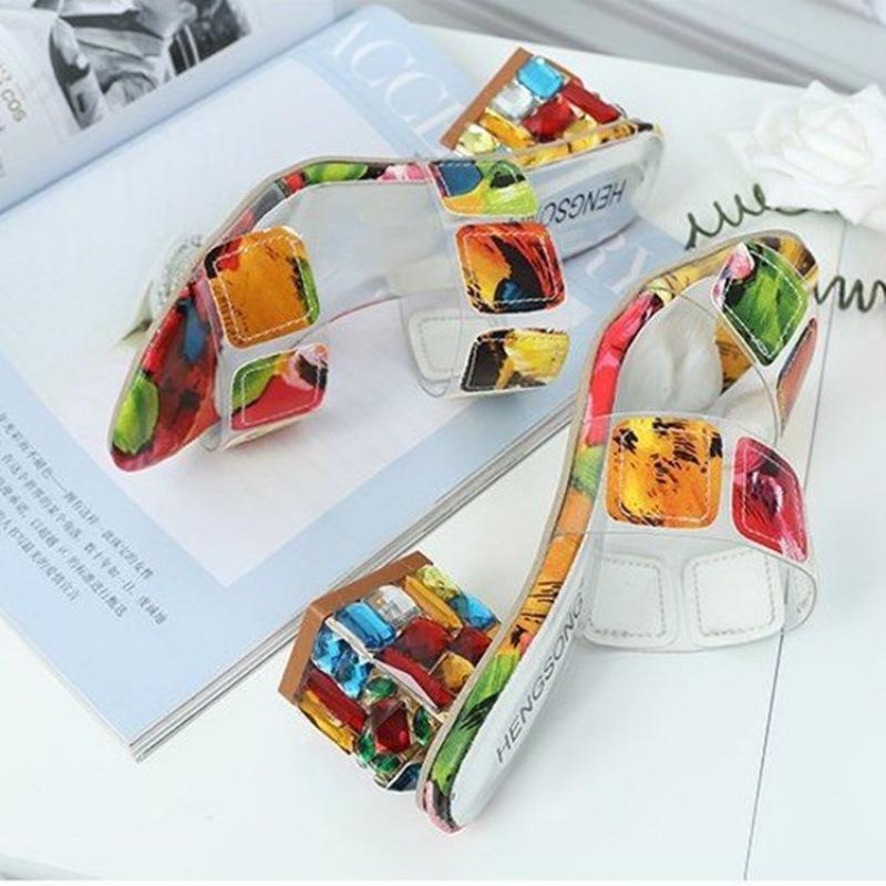 New rhinestone thick heel color one-word cool slippers color matching medium heel European and American style large size