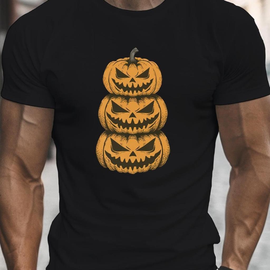 Herren Schwarz Halloween T-Shirt mit vertikalem Kürbis-Aufdruck Leichtes Kurzarm-Rundhals-Freizeit-Oberteil