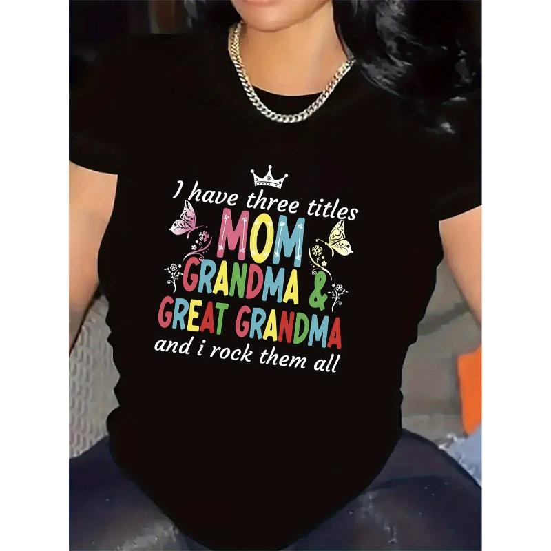Women's "I Have 3 Titles: Mom, Grandma, Great-Grandma" Print Tee Soft Polyester Round Neck Short Sleeve Casual Family Gift Top