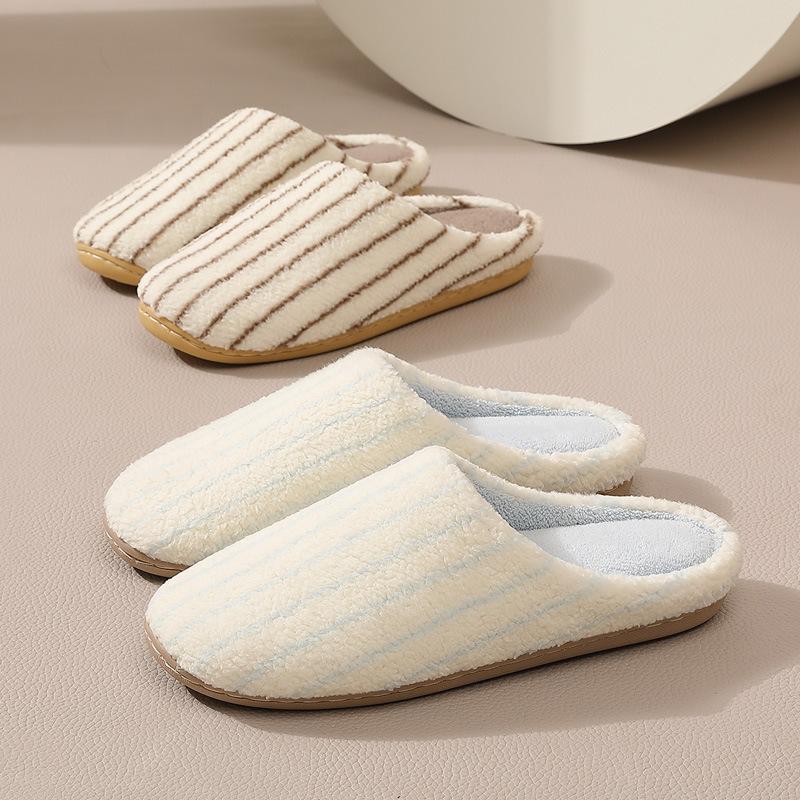 Japanese striped plush warm couple slippers autumn and winter new indoor soft bottom non-slip home cotton slippers