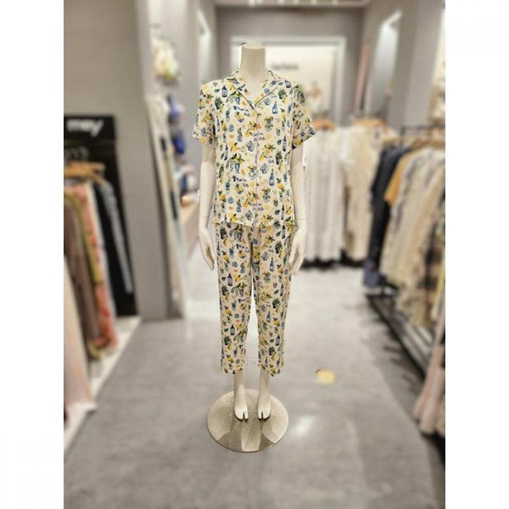 [Barbara] Lemon Print Women's Pajama (AWP4628B) is a top and bottom set made from imported German rayon fabric that highlights comfortable wear. The soft and lightweight rayon material is non-irritating to the skin and easy to wear. With a bright color palette and prints reminiscent of France, this piece emphasizes femininity and sophistication. The top features short sleeves, while the bottoms have a 9-length design, complemented by a soft waistband for great comfort.