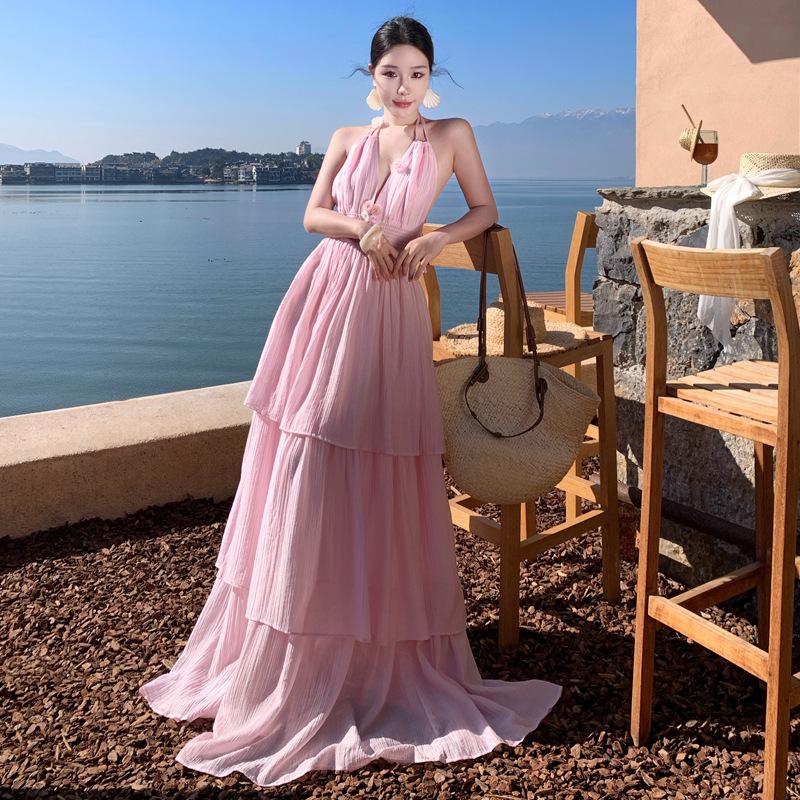 Sexy Collar Pink Suspender Dress Women's Summer Travel Seaside Vacation Beach Neck Skirt