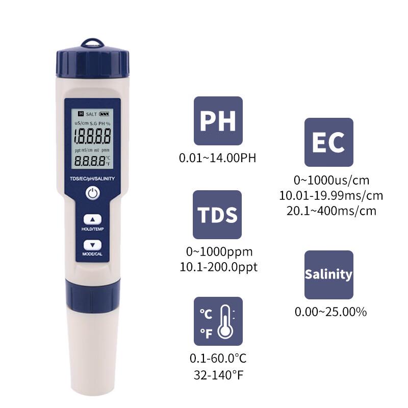 Longchan 5-in-1 Salinity, pH & Temperature Water Quality Tester