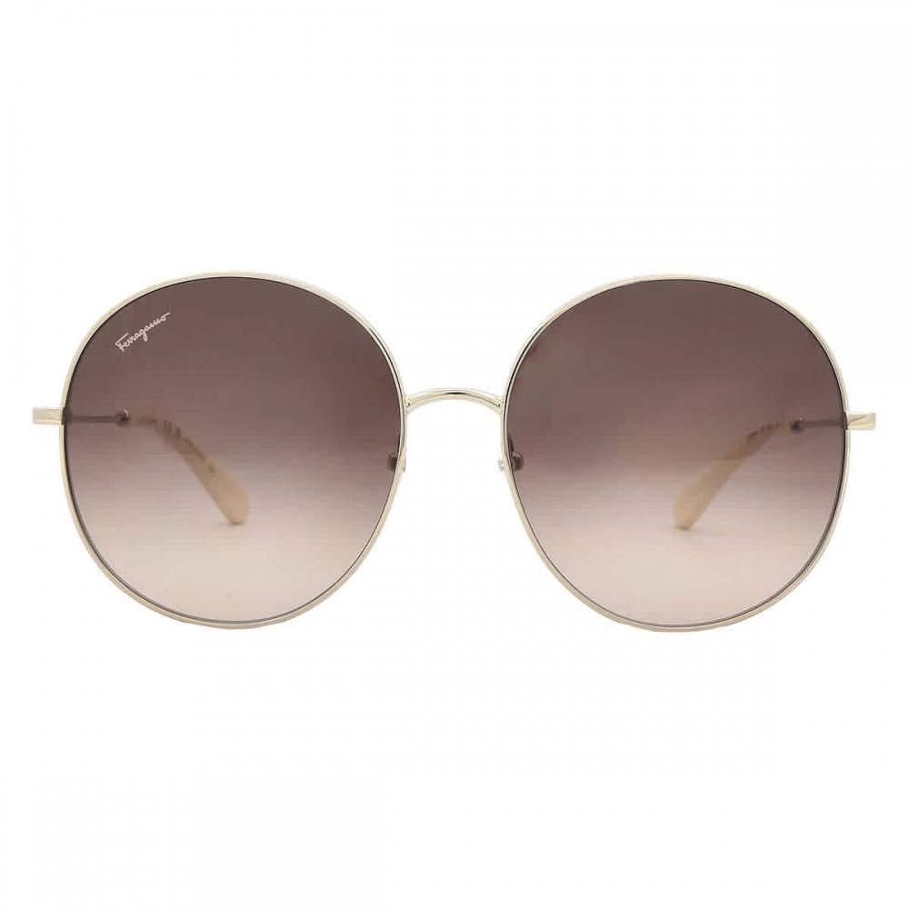 The Salvatore Ferragamo SF299S Sunglasses feature a round shape and brown gradient lenses, making them a stylish choice for women. With a gold frame color and full-rim style, these sunglasses provide 100% UV protection. The product's UPC code is 886895558907.