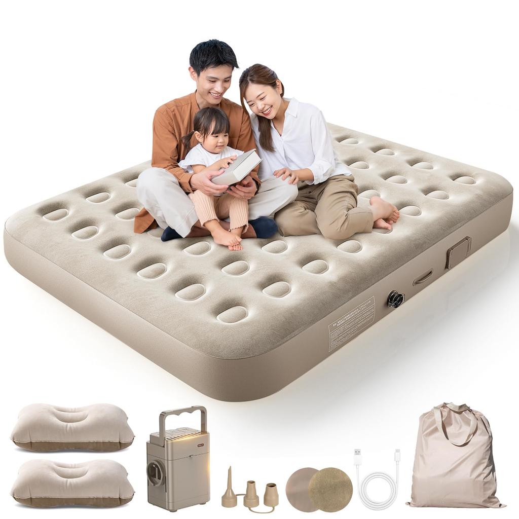🛏️【Integrierte elektrische Pumpe & automatische Aufblasung】 Diese Luftmatratze verfügt über eine eingebaute elektrische Pumpe, die mit nur einem Knopfdruck in nur zwei Minuten entleert und aufgeblasen werden kann. Sie können auch das Volumen der Luftmatratze an Ihre Bedürfnisse anpassen.. Zusätzlich kann die elektrische Pumpe abgenommen und separat verwendet werden, und sie wird mit drei Düsen für zusätzliche Verwendungszwecke geliefert.. Der integrierte Typ-C-Ladeanschluss leuchtet während des Ladevorgangs rot und grün, wenn er vollständig aufgeladen ist.. Diese einfach zu bedienende Oberfläche bietet ein komfortables und problemloses Outdoor-Erlebnis.