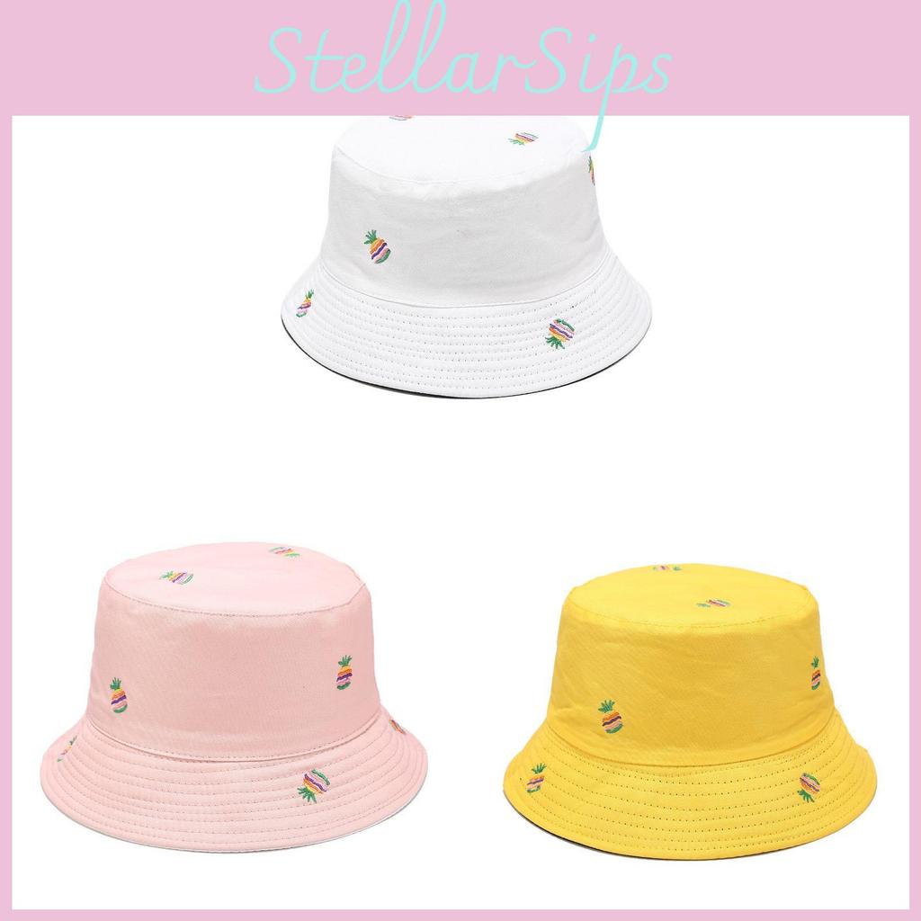 Summer Pineapple Embroidered Doublesided Sun Hat With Wide Brim In Cotton For Outdoor Sunblock And Fashion