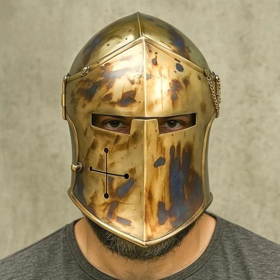 Der Helm im Barbuta-Stil wurde im 15. Jahrhundert von europäischen Rittern und Infanterie weit verbreitet.. Dieser Helm verfügt über:
