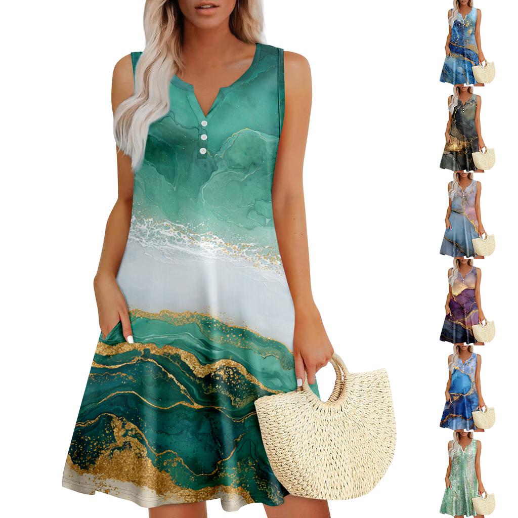 Damen Sommerkleider Lockeres V-Ausschnitt Ärmelloses Sommerkleid Kleid Mit Taschen