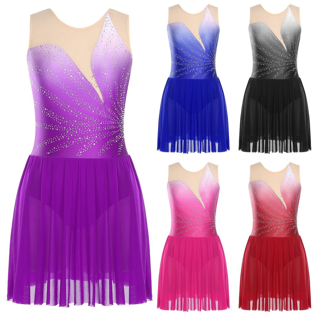 Damen Leotard für Lyrical & Eiskunstlauf: Ärmelloses Netz-Patchwork-Rhinestone-Kleid mit integriertem Druckknopfbodysuit für den Auftritt