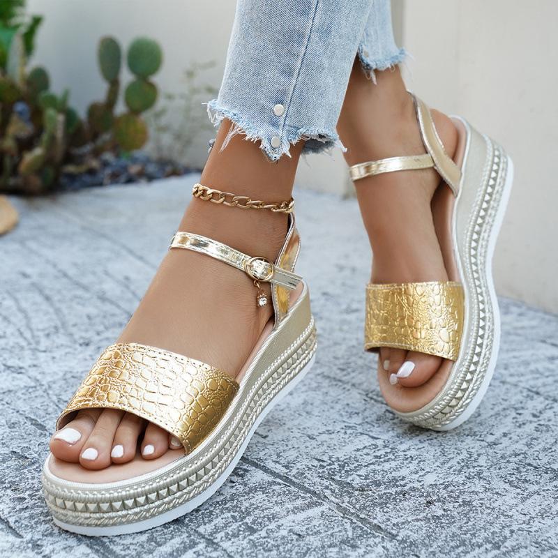Schuhe für Damen 2026 Sommer Mode Damen Peep Toe Plateau Keilsandalen Riemchen mit Schnalle Übergröße Sandalen Gold Damen Schuhwerk