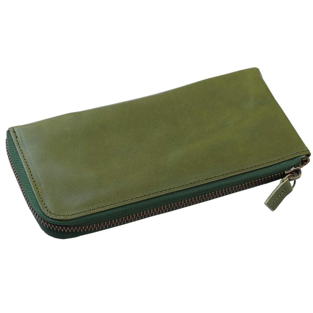 Feee Lange Geldbörse für Herren und Damen, Echtes Tochigi-Leder, Dünnes Keilfach, L-förmiger Reißverschluss, Hergestellt in Japan [FE-3011] (Grün)