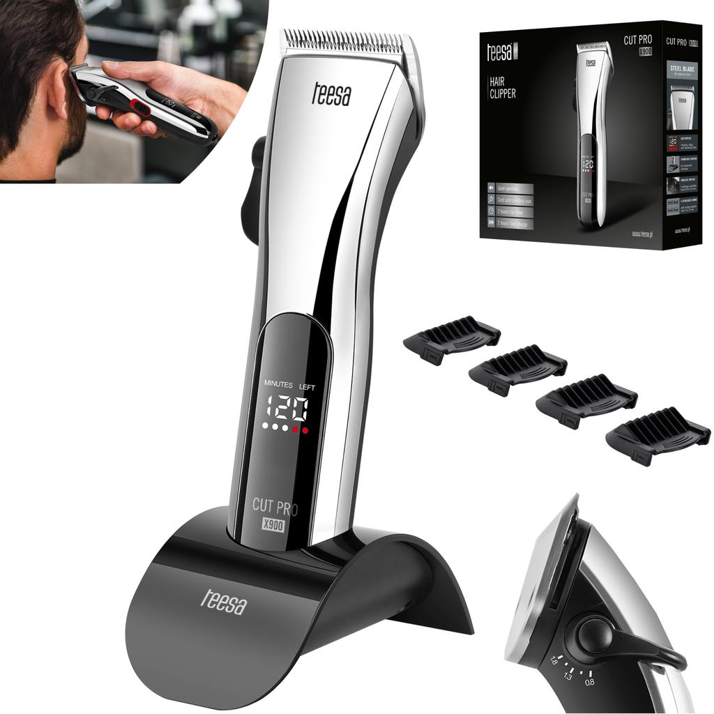 CUT PRO X900 Möchten Sie immer so aussehen, als kämen Sie gerade vom Friseur? Jetzt kannst du! Alles dank des Teesa CUT PRO X900 – ein Haarschneider, der Ihnen hilft, einen professionell geschnittenen Look zu erzielen, ohne das Haus zu verlassen.. Präzisionsklingen Sie werden überrascht sein, wie einfach Sie sich selbst die Haare schneiden können! Der Teesa CUT PRO X500 ist mit hochwertigen Stahlklingen ausgestattet, die es Ihnen ermöglichen, Ihr Haar perfekt zu stylen.. Jetzt können Sie schnell Ihre Traumfrisur kreieren. Kämme Genießen Sie immer eine perfekte Frisur! Der Teesa CUT PRO X900 wird mit vier Aufsätzen geliefert – 3 mm, 6 mm, 9 mm und 12 mm, sodass Sie ganz einfach die richtige Schnittlänge für sich auswählen können.. Fünfstufige Einstellungen Haareschneiden war noch nie so einfach! Zusätzlich zu den vier Aufsätzen verfügt der Teesa CUT PRO X900 auch über eine Fünf-Stufen-Einstellung – 0,8 mm, 1,05 mm, 1,3 mm, 1,55 mm, 1,8 mm, um das Styling Ihrer Haare zu erleichtern.. LED-Anzeige Für noch mehr Benutzerkomfort ist das CUT PRO X900 mit einer LED-Anzeige ausgestattet, die nicht nur den Akkustand und die verbleibende Laufzeit anzeigt, sondern Sie auch daran erinnert, wann das Gerät geölt werden muss. Dockingstation Der CUT PRO X900 ermöglicht sowohl das kabelgebundene als auch das kabellose Trimmen. Das Set enthält eine Ladestation, die sicherstellt, dass der Akku des Geräts immer geladen ist und Ihr CUT PRO X900 immer einsatzbereit ist – wann immer Sie ihn brauchen..