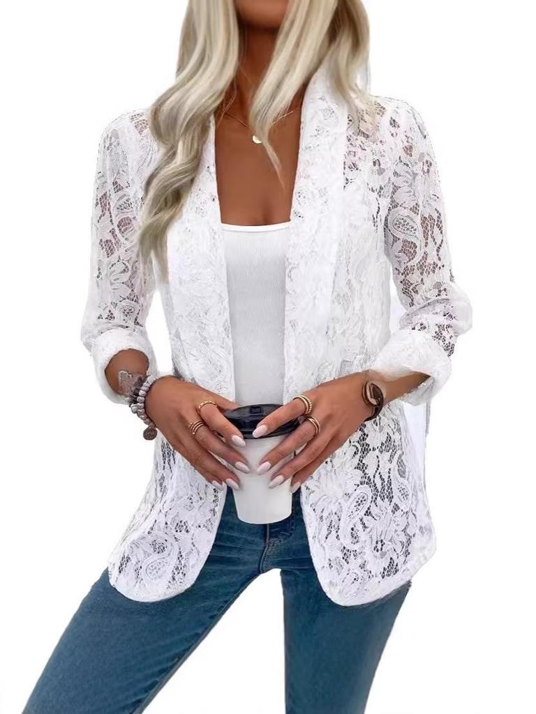 Entdecken Sie eine Mischung aus Eleganz und Komfort mit dieser stilvollen Jacke, perfekt für die Frühjahr/Sommer-Saison 2025.. Gefertigt aus hochwertigem Polyester, bietet diese Jacke ein weiches und leichtes Gefühl und sorgt so für Komfort den ganzen Tag über.. Der maßgeschneiderte Ausschnitt verleiht eine raffinierte Note, während die aufwendige Spitzenverzierung für ein zartes, modisches Flair sorgt.. Ideal für eine Vielzahl von Outfits, ist diese einfarbige Jacke eine vielseitige Ergänzung für jede Garderobe und vereint mühelos europäische und amerikanische Stilrichtungen.