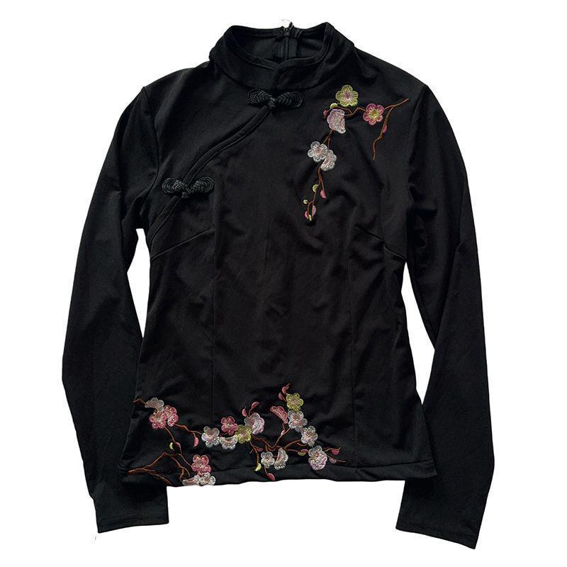 Schwarzes Cheongsam-Oberteil für Damen: Pflaumenblüten-Stickerei, Froschknopf, Langarm