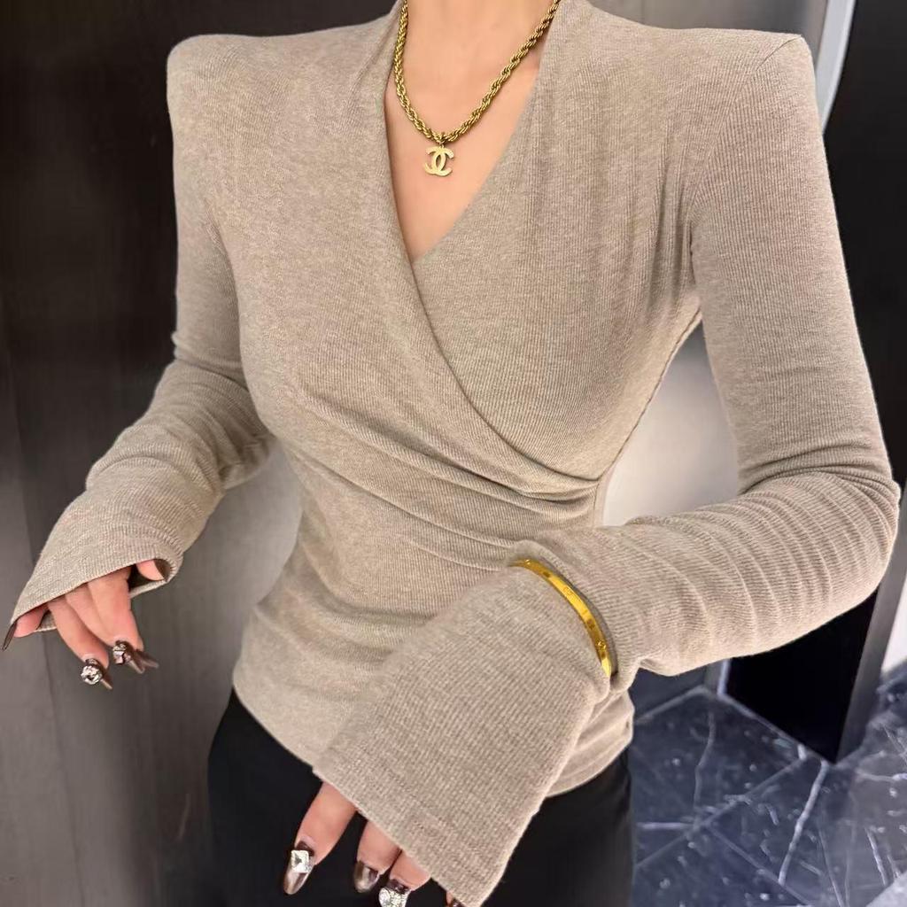 2025 Herbst/Winter Thermisches V-Ausschnitt Schlankmachendes Langarm Koreanisches Mode-T-Shirt für Damen