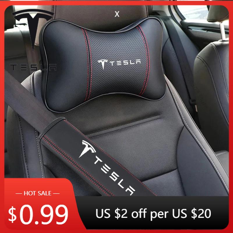 Autoaufkleber 2025 Heißes Leder Auto Kopfstütze Nackenkissen Sicherheitsgurt Schulterpolster Innenzubehör Für Tesla Model 3 Model S X Mod