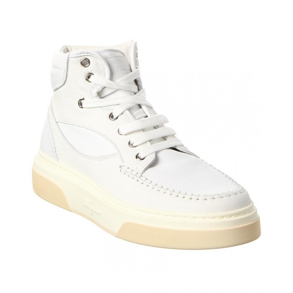 Elevate your casual style with the Ferragamo Leather Sneaker from Salvatore Ferragamo. Made in Italy, this sleek white leather sneaker features silver-tone hardware and a lace-up closure. The lightly padded leather insole and rubber sole with traction provide all-day comfort and support. The iconic Gancini logo adds a touch of luxury to this classic silhouette.