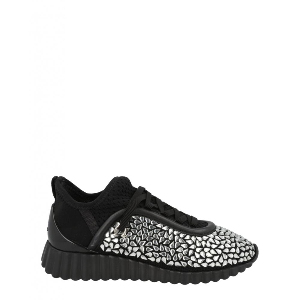 The product comes in black, featuring a smooth finish with crystal embellishments that create a stylish impression. The upper is made of 90% polyamide and 10% calfskin leather, while the lower part is composed of 100% rubber. The sneaker requires special cleaning. It boasts an almond toe style, low-top design, and highlights patent leather heel accents, a toe cap, and the iconic Gancini detail.
