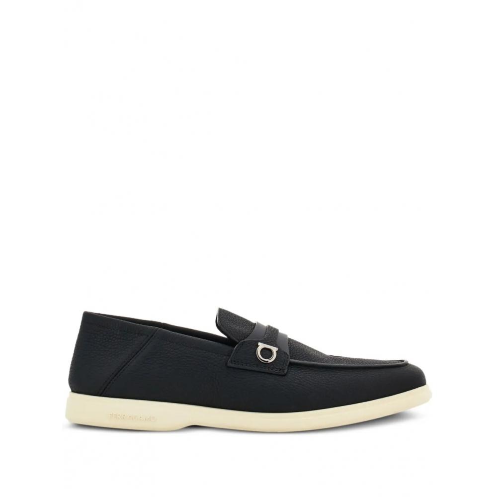 The Salvatore Ferragamo Gancini Plaque Leather Loafer is crafted from black pebbled leather. It features silver-tone hardware and a round toe design, making it a stylish slip-on option that is easy to wear. The sole bears the brand's logo, and the flat sole provides excellent comfort. Made from calfskin, this shoe combines luxurious aesthetics with durability.