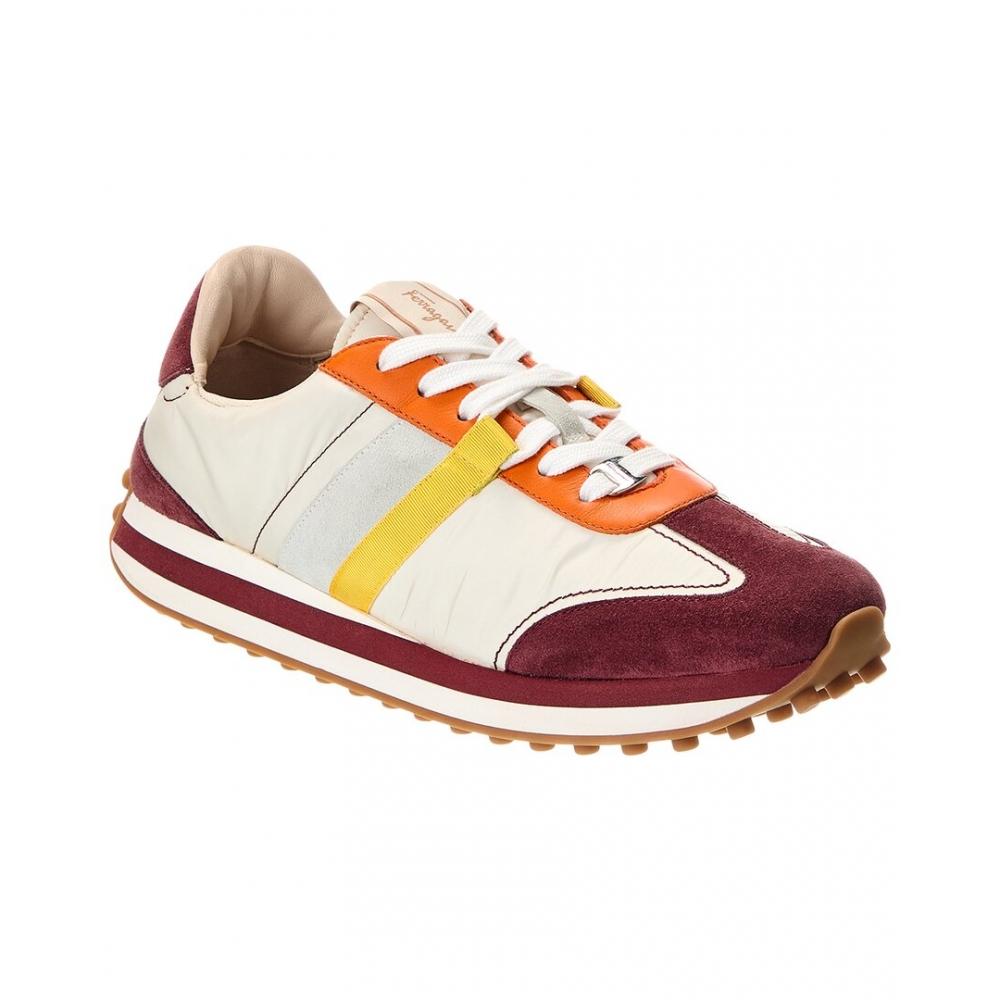 Elevate your sneaker game with the Ferragamo Iulio Suede Sneaker from iconic brand Salvatore Ferragamo. Made in Italy, these stylish sneakers feature a purple multicolor nylon and suede design with silver-tone hardware, a logo tongue, and grosgrain trim. The lace-up closure ensures a secure fit, while the lightly padded leather insole provides all-day comfort. Finished with a rubber sole for traction, these sneakers are perfect for adding a pop of color to any outfit. With different sizing options available, you can find the perfect fit for your feet. Shop with confidence knowing our products are 100% genuine and authentic.