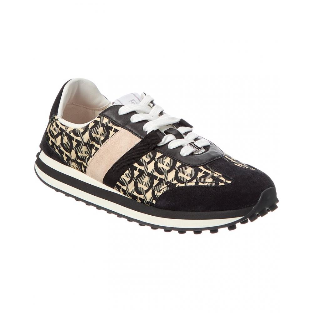 Elevate your casual look with the Ferragamo Gancini Canvas & Suede Sneaker from Salvatore Ferragamo. Crafted in Italy, these sneakers feature a black Gancini printed canvas and suede upper with gold-tone hardware and grosgrain trim. The lace-up closure ensures a secure fit, while the lightly padded leather insole provides all-day comfort. Finished with a rubber sole for traction, these sneakers are both stylish and practical. Whether you're dressing up a pair of jeans or completing a casual suiting look, these sneakers are sure to make a statement. Shop with confidence knowing that our products are 100% genuine, sourced from trusted independent suppliers.