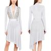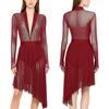 Damen Lyrical Tanzkleid S-XXL: Transparenter Netzstoff Langarm mit glitzernden Strasssteinen & Eingearbeiteten Schrittknöpfen Höschen Rüschen Design