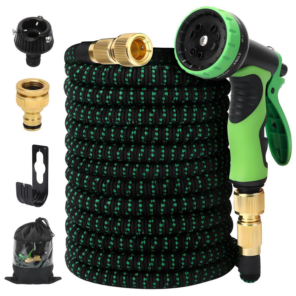 [3x Expandable Natural Latex Material] Our garden hose boasts excellent elasticity, expanding up to three times its original size (e.g., from 10m to 30m) under water pressure, and automatically retracts after use. It features a 2mm latex inner layer and an ultra-strong outer layer for superior abrasion resistance and durability. It can withstand temperatures ranging from -10°C to 60°C, making it suitable for all-season use, regardless of extreme cold or heat. [Enhanced Durability with Metal Connector] By replacing the conventional plastic connector with a metal one, the garden hose's durability has been dramatically improved. This significantly reduces the risk of breakage when dropped, ensuring stable long-term use even in harsh outdoor environments. Furthermore, its lightweight design allows for easy one-handed operation, even for elderly people and children. This expandable garden hose strikes a balance between durability and ease of use. [Includes Multi-Function Faucet Connector] The expandable hose comes with a built-in faucet nipple, allowing for easy attachment to a wide range of round faucets, from 14mm to 18mm. When not in use, the included hose reel hook allows for compact storage. The included O-ring is built into the metal connector of the hose, improving leak prevention. *The hose length may vary depending on the water pressure.