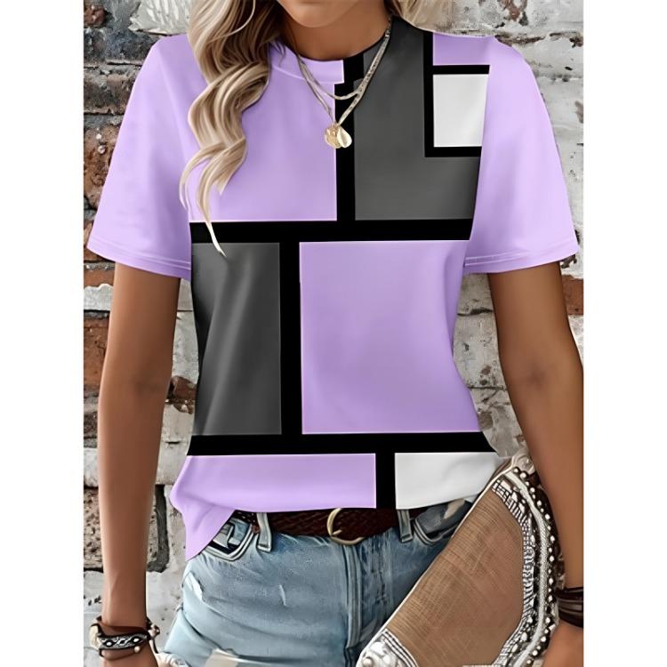 Damen T-Shirt Sommer Mode Lässiges T-Shirt Rundhals Kurzarm Kariert Colorblock Rosa Blau Lila Druck Normale Passform Täglich Ausgehen