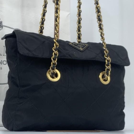 PRADA Shoulder Bag Quilted Gold Chain Tessuto Nylon Leather Black Women's Triangle Plate Logo