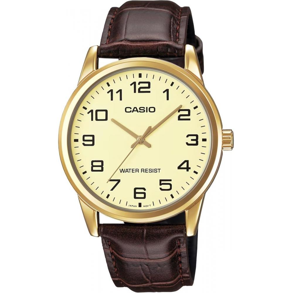 The CASIO Analog Quartz Men's Watch MTP-V001GL-9B boasts a simple yet sophisticated design. Its gold and cream yellow colors harmoniously blend to match any style, making it practical with its everyday water resistance. The watch features a mineral glass, allowing for a clear view of the watch face.