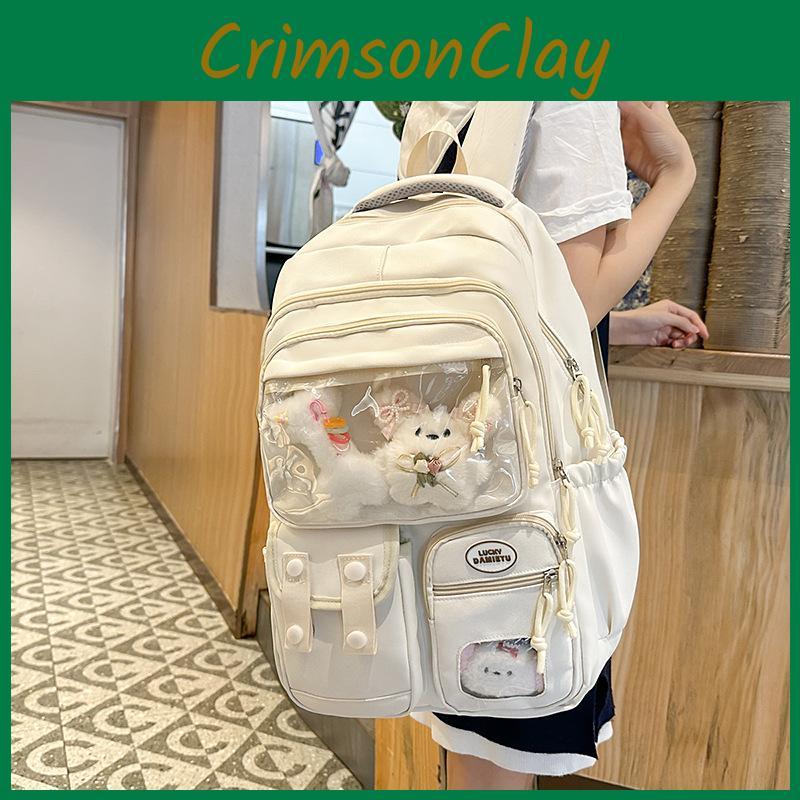 Einfacher einfarbiger Studentenrucksack mit transparentem Fach und Puppendekor für die Uni und Reisen