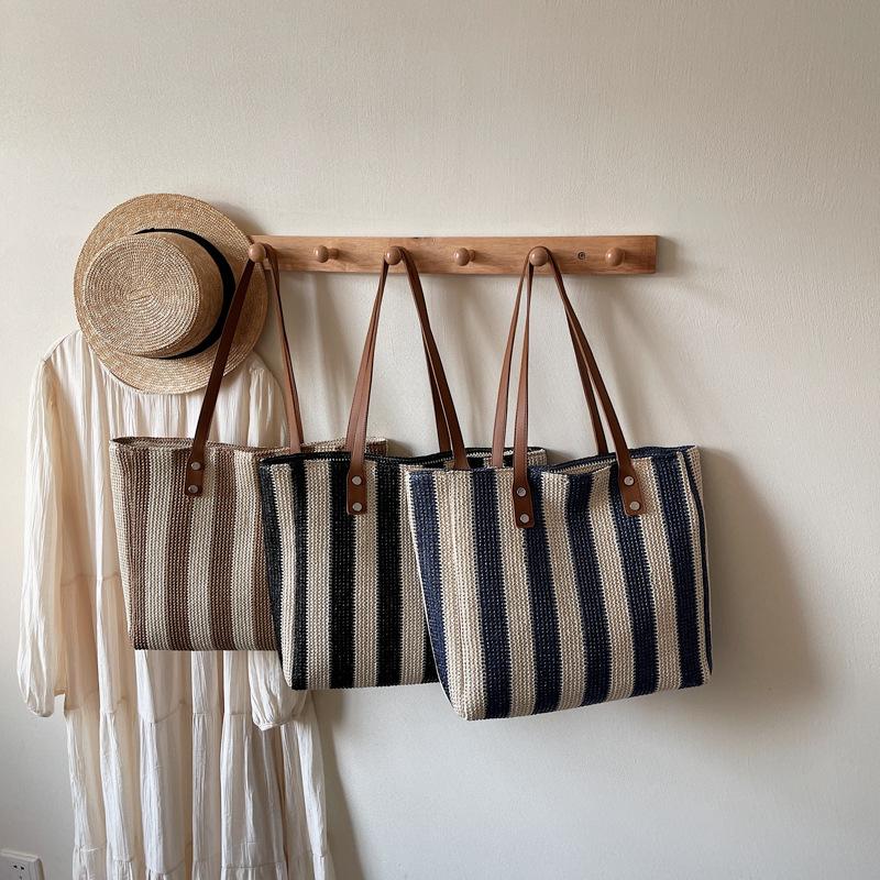 Large capacity fashionable hand-held straw bag women's new Korean version striped shoulder bag vacation leisure beach bag