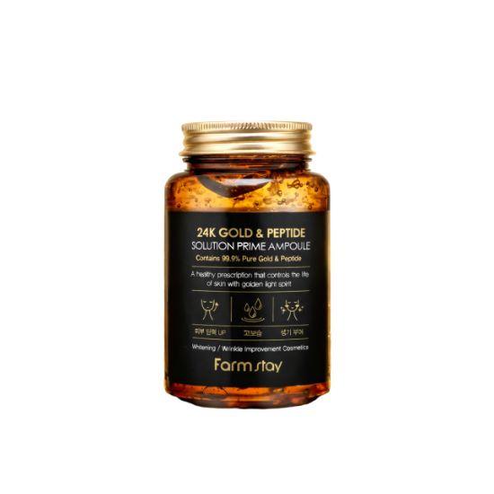 Revitalize and firm your skin with the Farmstay 24K Gold & Peptide Solution Prime Ampoule. Infused with 24K gold and peptide complex, this luxurious ampoule helps improve skin elasticity, reduce the appearance of fine lines, and deliver deep hydration. Its lightweight yet nourishing formula absorbs quickly, leaving skin radiant, smooth, and rejuvenated. Perfect for daily anti-aging care and a more youthful-looking complexion.