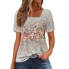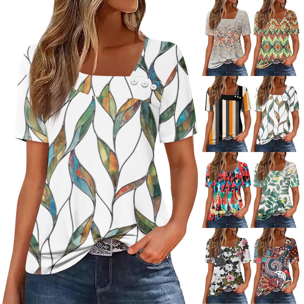 Damen T-Shirt mit lässigem Print, asymmetrischem Halsausschnitt, kurzen Ärmeln, dekorativen Knöpfen