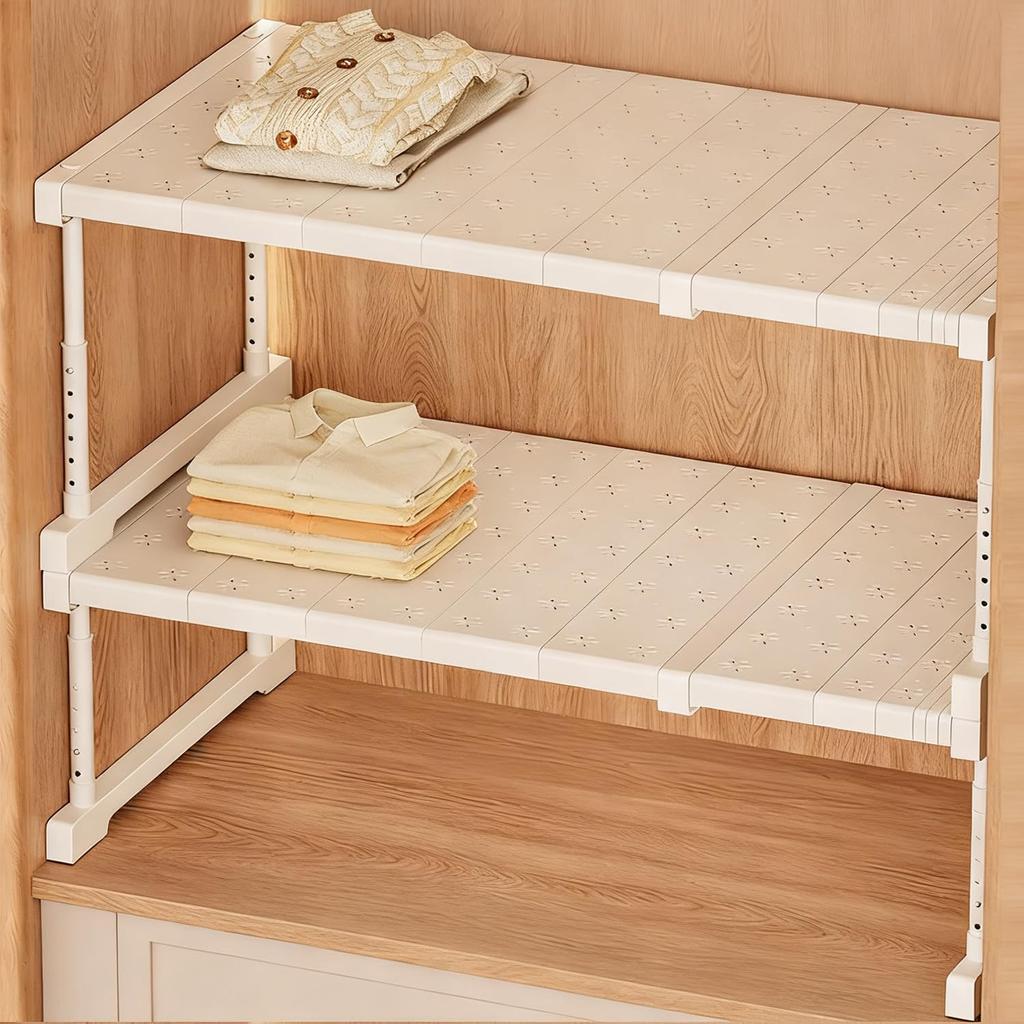 [Extendable Closet Storage Shelf: Adjustable Length and Height for Perfect Fit] This closet storage rack features a sliding mechanism, allowing for adjustable length and height. It perfectly fits various spaces, including closets, wardrobes, under-sink areas, and kitchen shelves. [Easy Tool-Free Assembly & Strong Lock] No screws or drills are required. Simply insert the pipes for easy assembly. After adjustment, lock the shelf in place for a stable, wobble-free storage unit. [Durable Material Resistant to Rust and Mold with High Load Capacity] This closet storage shelf uses iron pipes and PP resin shelves. It boasts excellent durability even in humid environments. It can withstand a heavy load of up to 30kg (at its shortest setting), and is designed to be long-lasting, resistant to cracking and deformation. [Safe Freestanding Design & Space-Saving Foldable Storage] This closet storage rack is freestanding, not a tension-rod type, so it won't damage walls. When not in use, it can be easily folded for slim storage in narrow spaces. [Excellent organizational capabilities with flexible horizontal and vertical layout] Closet storage rack. Not only can it be placed horizontally, but it can also be stacked vertically to create multi-tiered shelves. It can also be used as a divider within the closet.