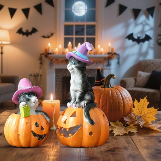 Halloween Katze auf Kürbis Figur Niedliche Kürbis Katze Statue Innen Harz Skulptur für Regal Tischplatte Schlafzimmer Eingangsbereich Deko