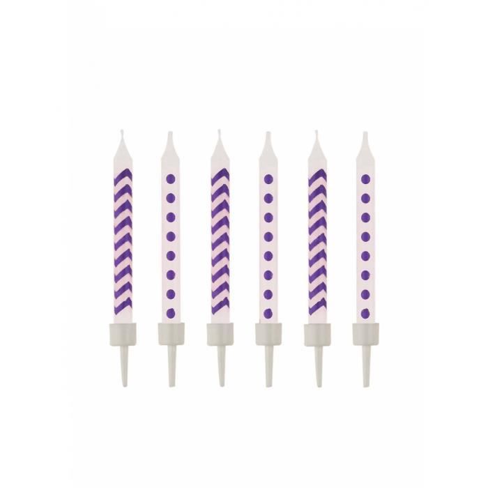 Bougies d'anniversaire - Lot de 10 - Violet - Motif chevron et pois - Hauteur 6,5 cm, bobèche blanche