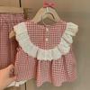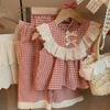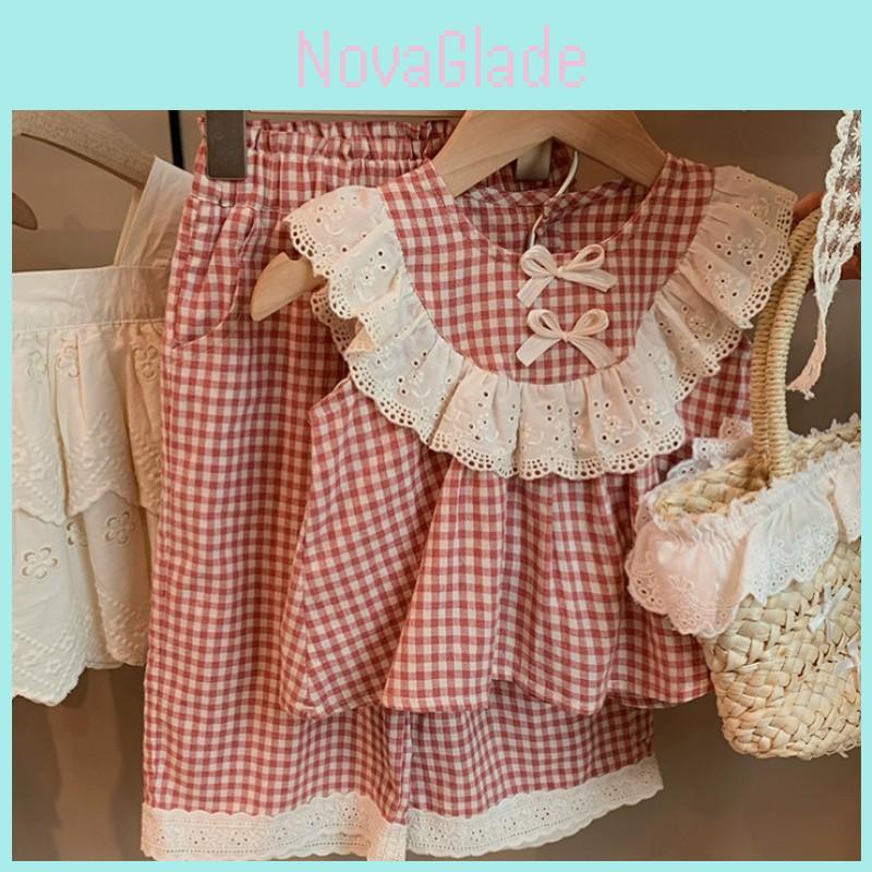Cute Pink Summer Set For Girls Featuring Stylish Plaid Dress And Lace Trim Top For Ages Eight And Up