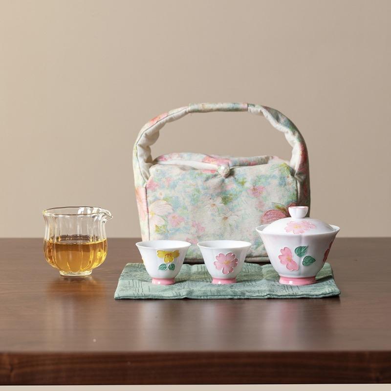 Handbemaltes florales Porzellan Gaiwan-Set mit 2 Tassen Tragbares Reise-Teegeschirr Chinesisches Gongfu-Tee-Geschirr Geschenkbox