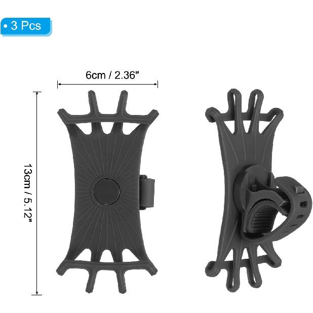 Color: Black, Material: Silicone, Overall Size: 13x6cm / 5.12"x 2.36" (L*W), Maximum Stretch Size: 16.5x8cm / 6.5"x3.15" (L*W), Packing List: 3Pcs x Bike Phone Mount.
