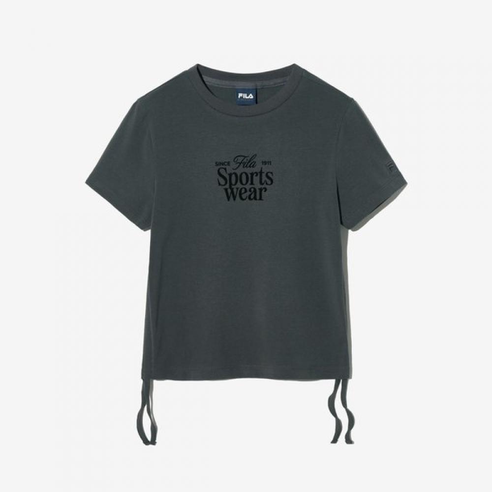 The FILA Shirring Graphic T-shirt is designed for women's hiking/outdoor use and features a short sleeve. The shirring detail creates a slimming effect on the waistline. It offers a comfortable fit with a round neck design and a skin-fit cut. Available in Charcoal color, it is characterized by its colorful graphic prints.