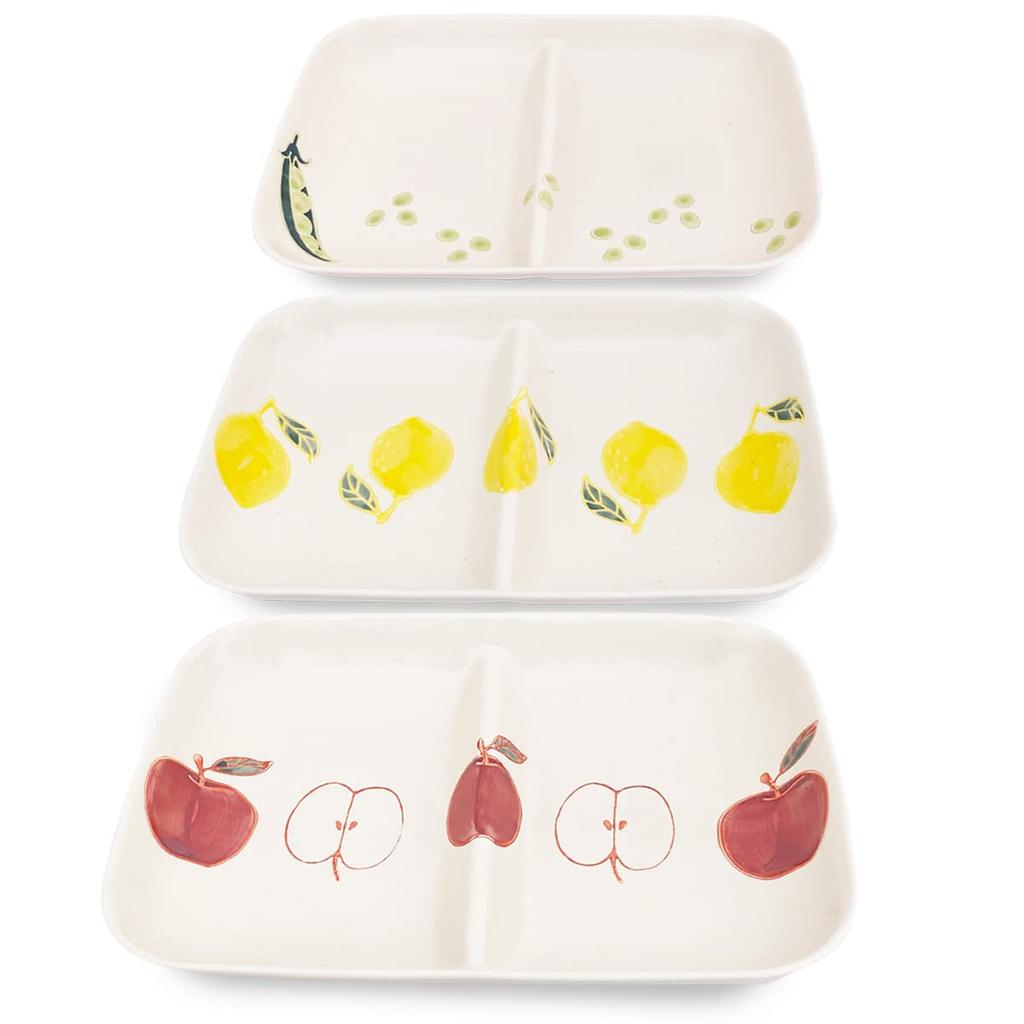 J-kitchens (Koubou Sho) Hasami Ware Divided Lunch Plate Set of 3, Microwave Safe, Fresh Art (Apple, Lemon, Bean) - Made in Japan