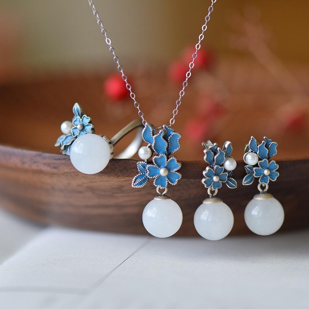 Vintage Blumenschmuck-Set für Damen Hanfu Qipao Outfits Faux Hetian Jade Ohrringe Halskette Ring